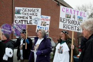 ACLU members are protesting outside of Rep. Darlene Senger's Naperville office Wednesday to fight her efforts to "regulate abortion out of existence" in Illinois.