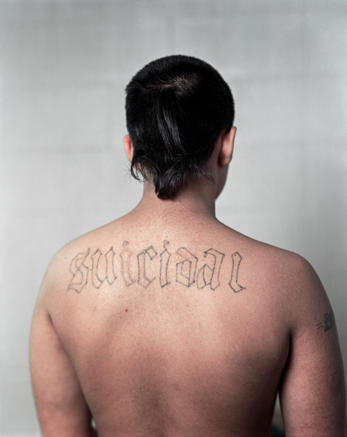 In another photo a boy alone in a cell stretches out on a cot with his legs propped up in an emotionally void stage–like setting. His loose pants fall gently in folds down his legs. He’s an object like the fixtures, patterns of worn floor paint, and the barren wall. He appears as lifeless as the discarded blanket on the floor. Other photos show restraining rooms with their gruesome paraphernalia of straps and buckles.